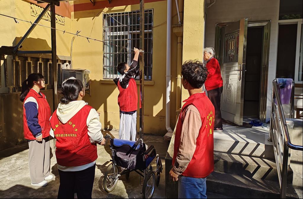 组织“金晖助老,情暖夕阳”服务活动。服务队的同学们前往九职社区和濂溪区敬老院帮助老人晾晒衣物,陪伴老人唠家常,给他们倒热水,帮助修剪指甲,通过志愿服务感受“服务人民、助人为乐”的奉献精神。