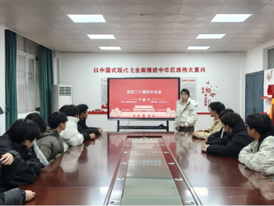 为深入学习贯彻党的二十届四中全会精神,切实提升学生骨干的政治素养,汽车工程学院学生会于2025年12月5日在一号实验楼218组织全体工作人员开展“学习党的二十届四中全会精神”专题学习活动,10余名学生会骨干参与。